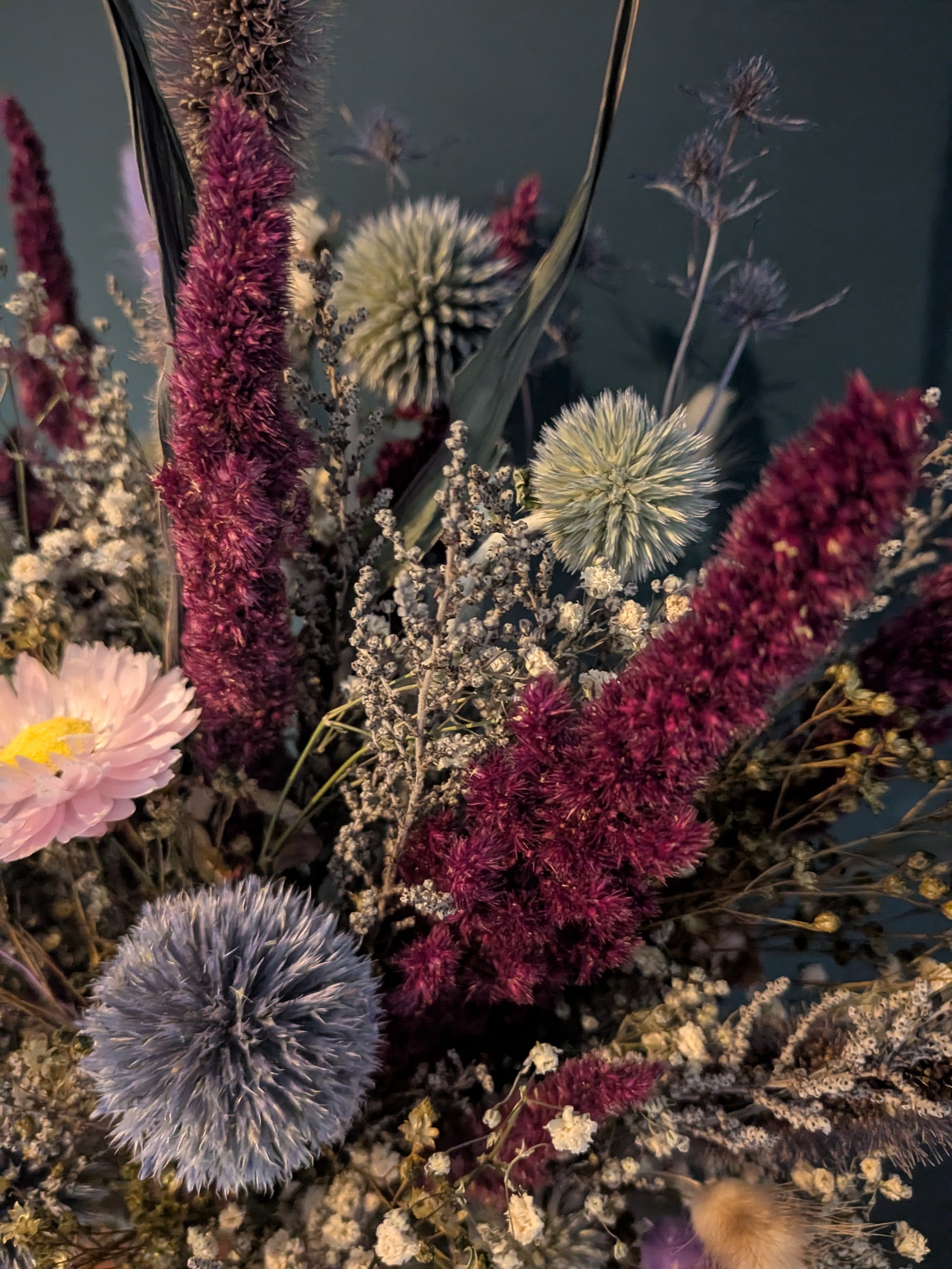 Featuring rich burgundy tones, soft blush pinks, and textured thistles, beautifully styled in a clear glass vase and finished with a deep wine ribbon. This piece has a moody, romantic feel and looks stunning as a statement for a shelf, table, or gift.