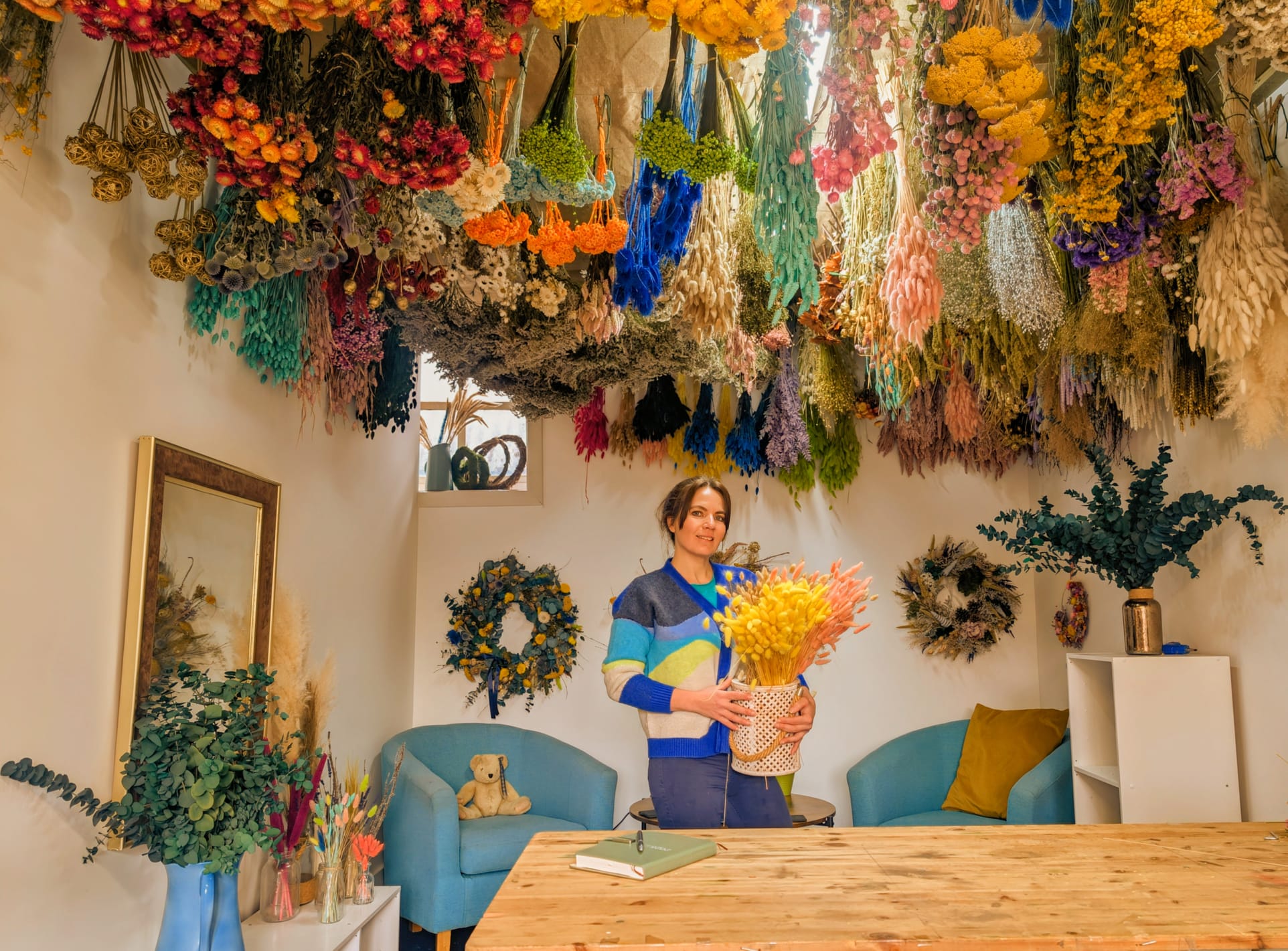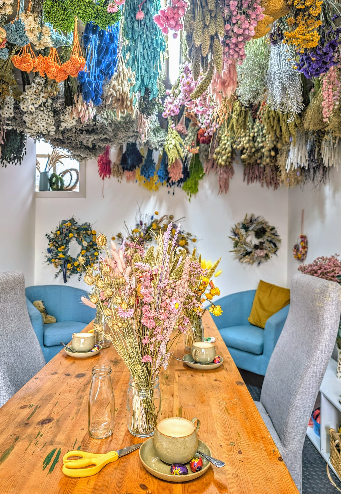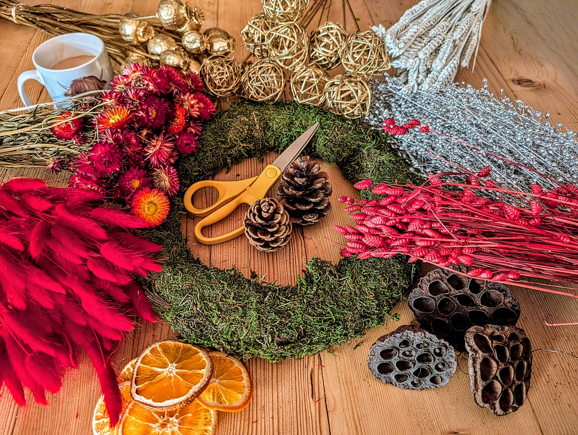 Front door wreath making workshop made using a mixture of fresh fir and colourful dried flowers that have been carefully selected for outside on your door.