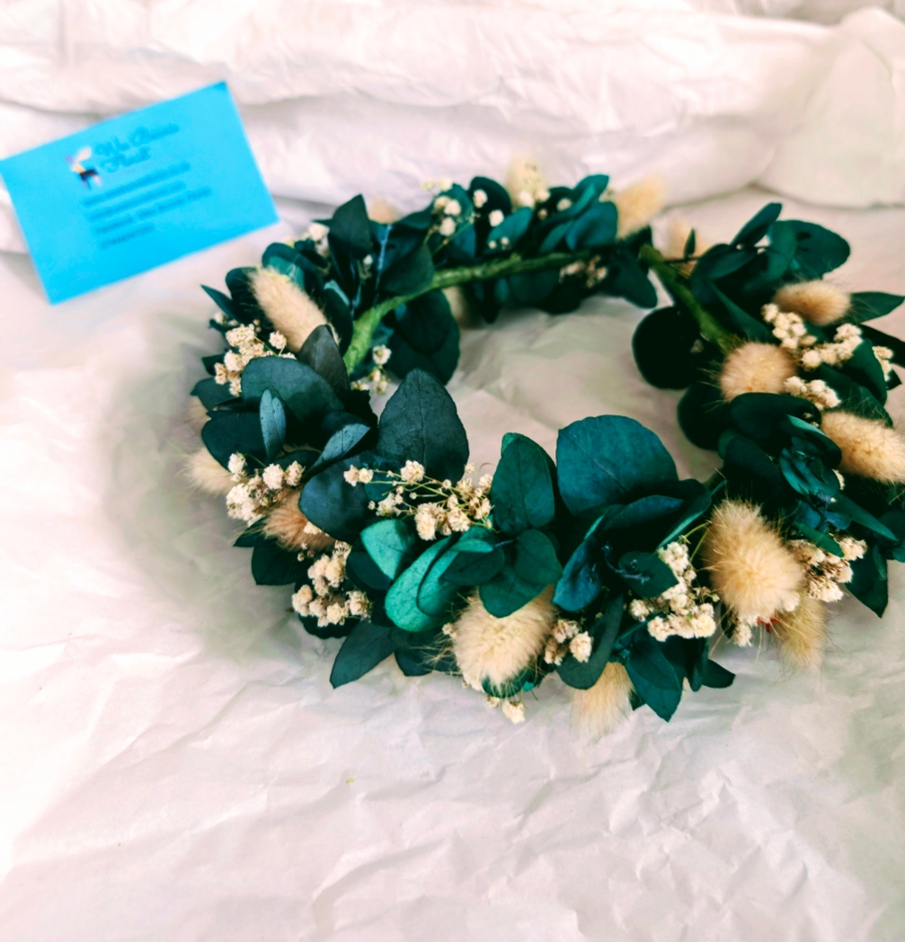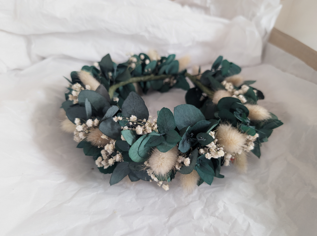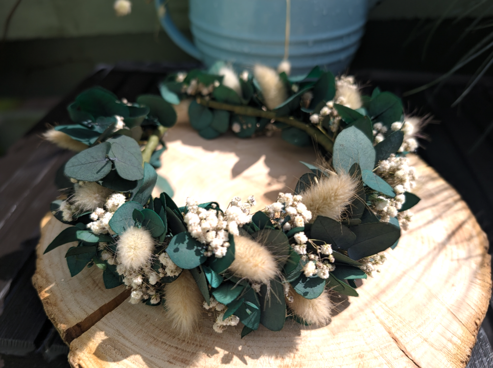 Dried Eucalyptus, Gypsophila and Bunny tail wedding headband