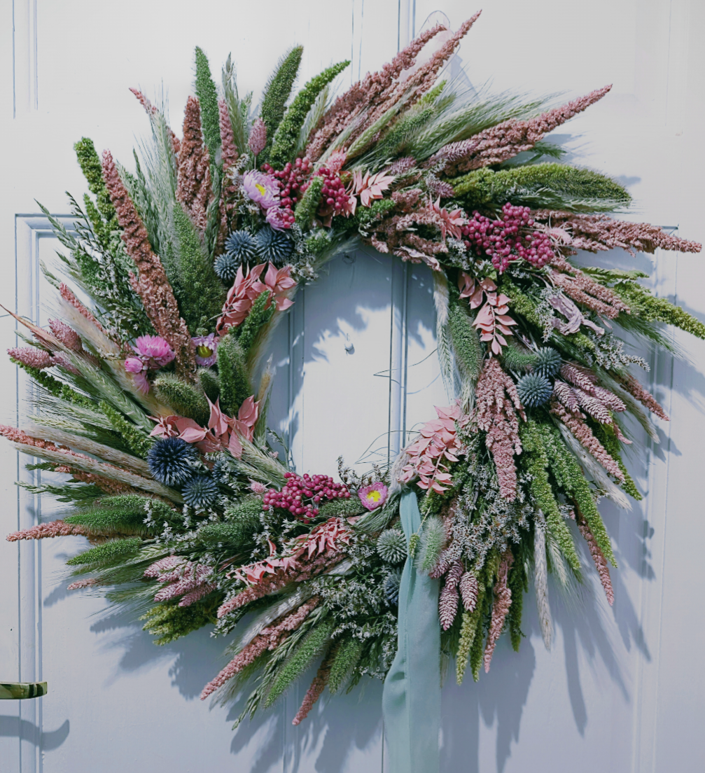 Pinks and greens with an undertone of natural dried and preserved stems.