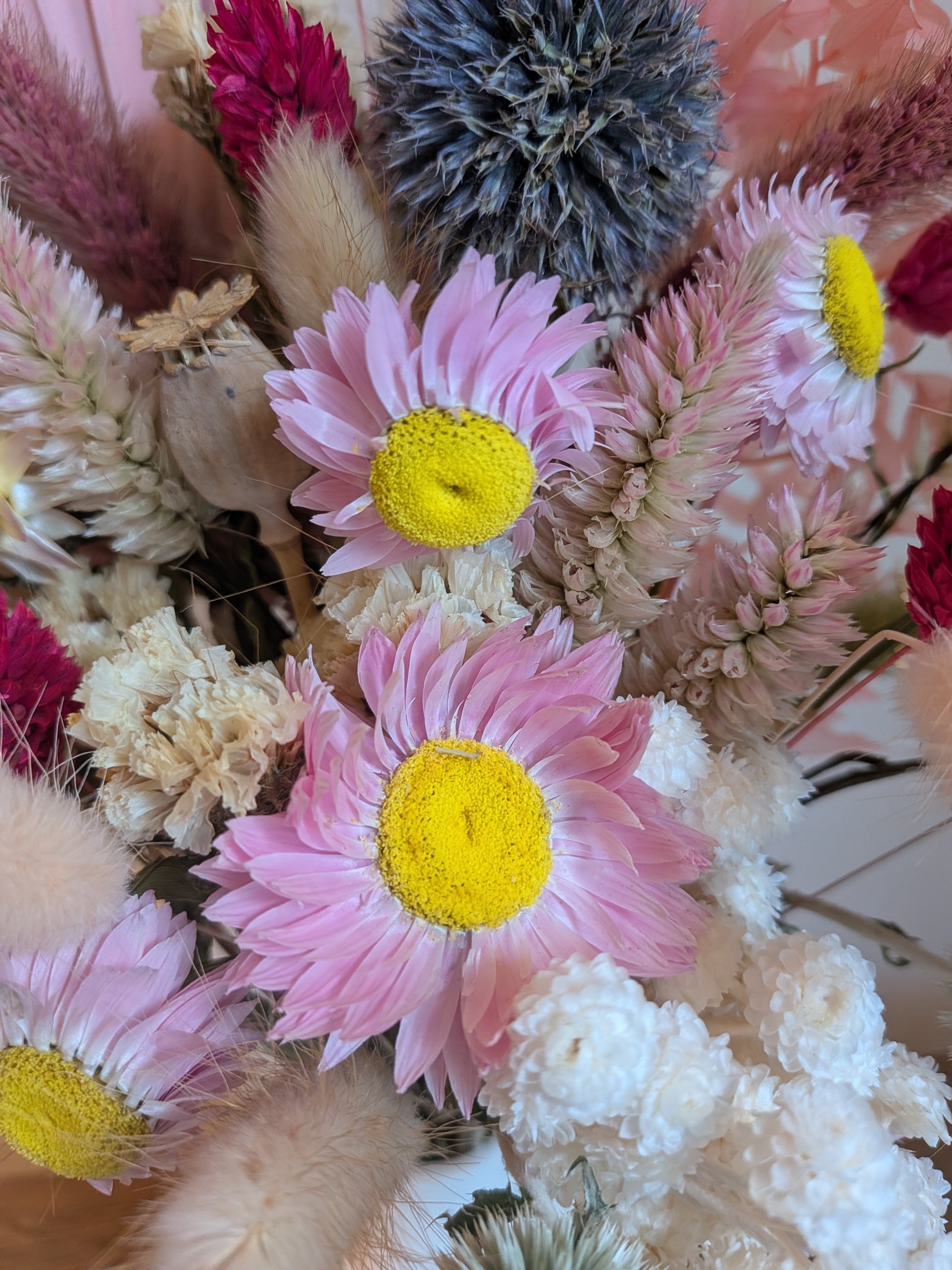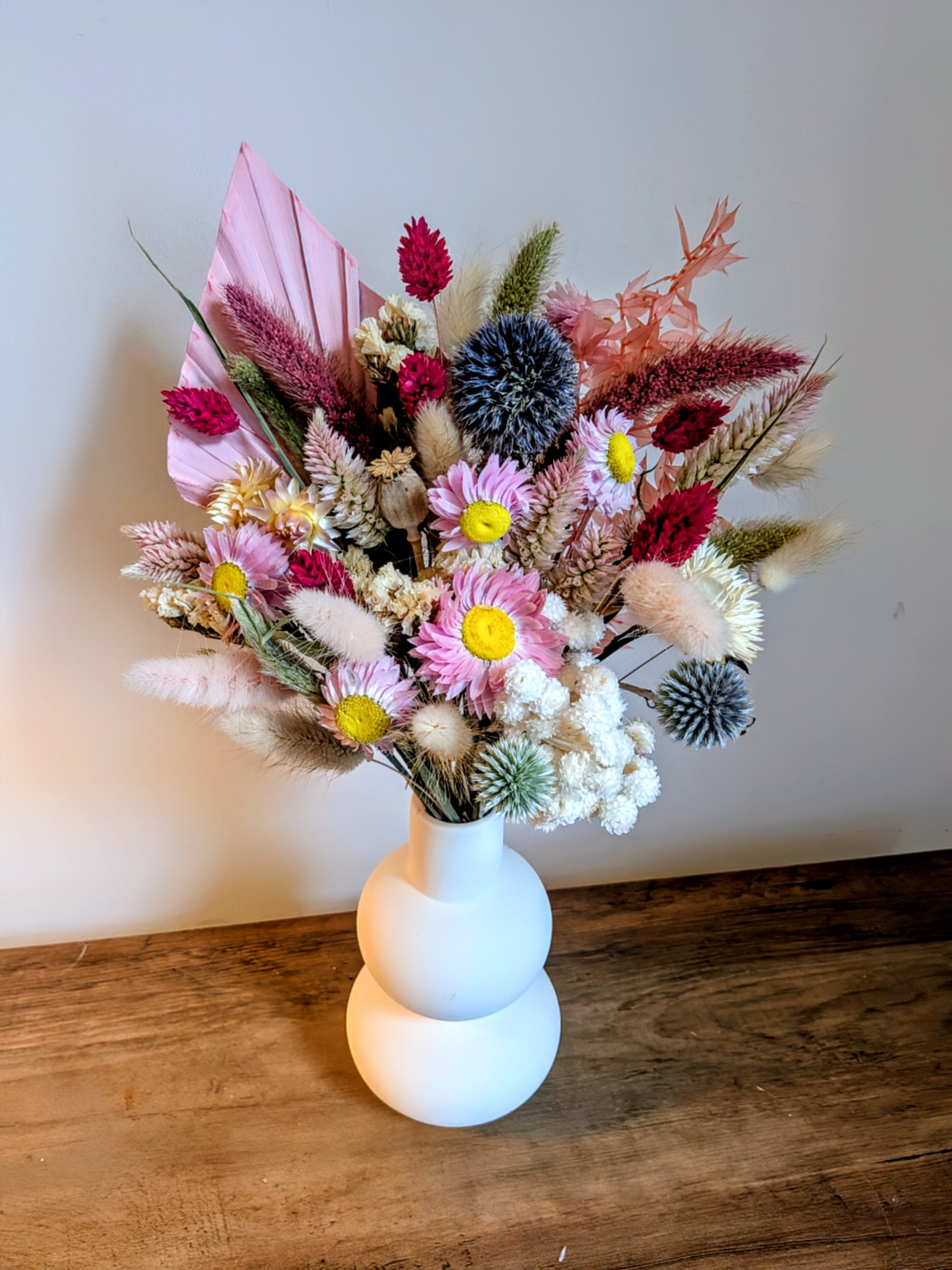 Blush Meadow is a softly sculptural dried flower arrangement designed to bring warmth and quiet beauty into any space. Featuring a delicate palette of blush pinks, creamy neutrals, and gentle pops of raspberry and soft blue-grey, this arrangement blends texture and tone in a modern, natural way.