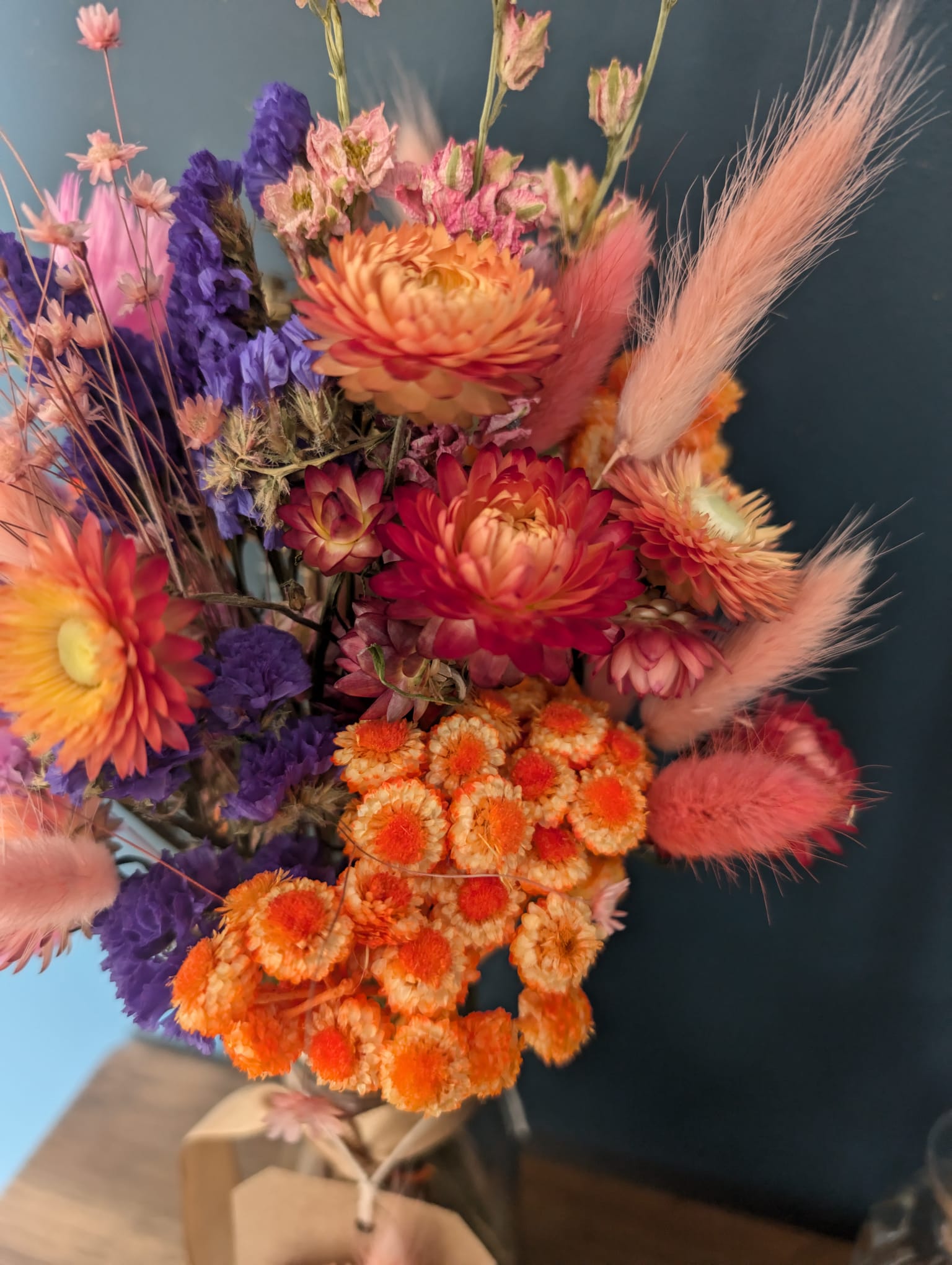 These pastel pinks mixed in with bright, bold , purple, orange, pink and gold flowers bring an array of colour to any space, adding a touch of beauty and liveliness. With a variety of hues, they create a stunning visual display that is sure to catch the eye. Enhance your surroundings with the natural beauty of these colourful flowers.