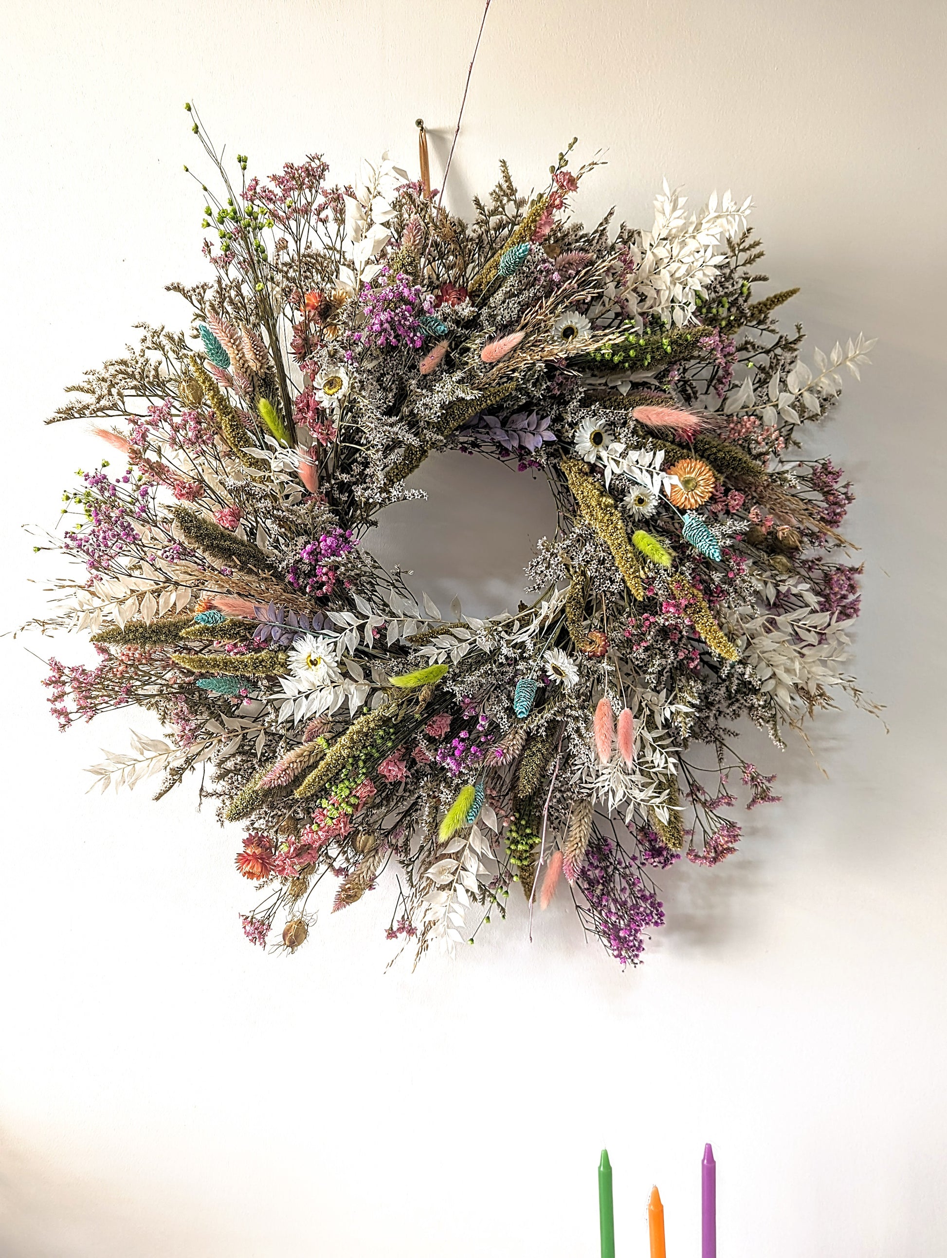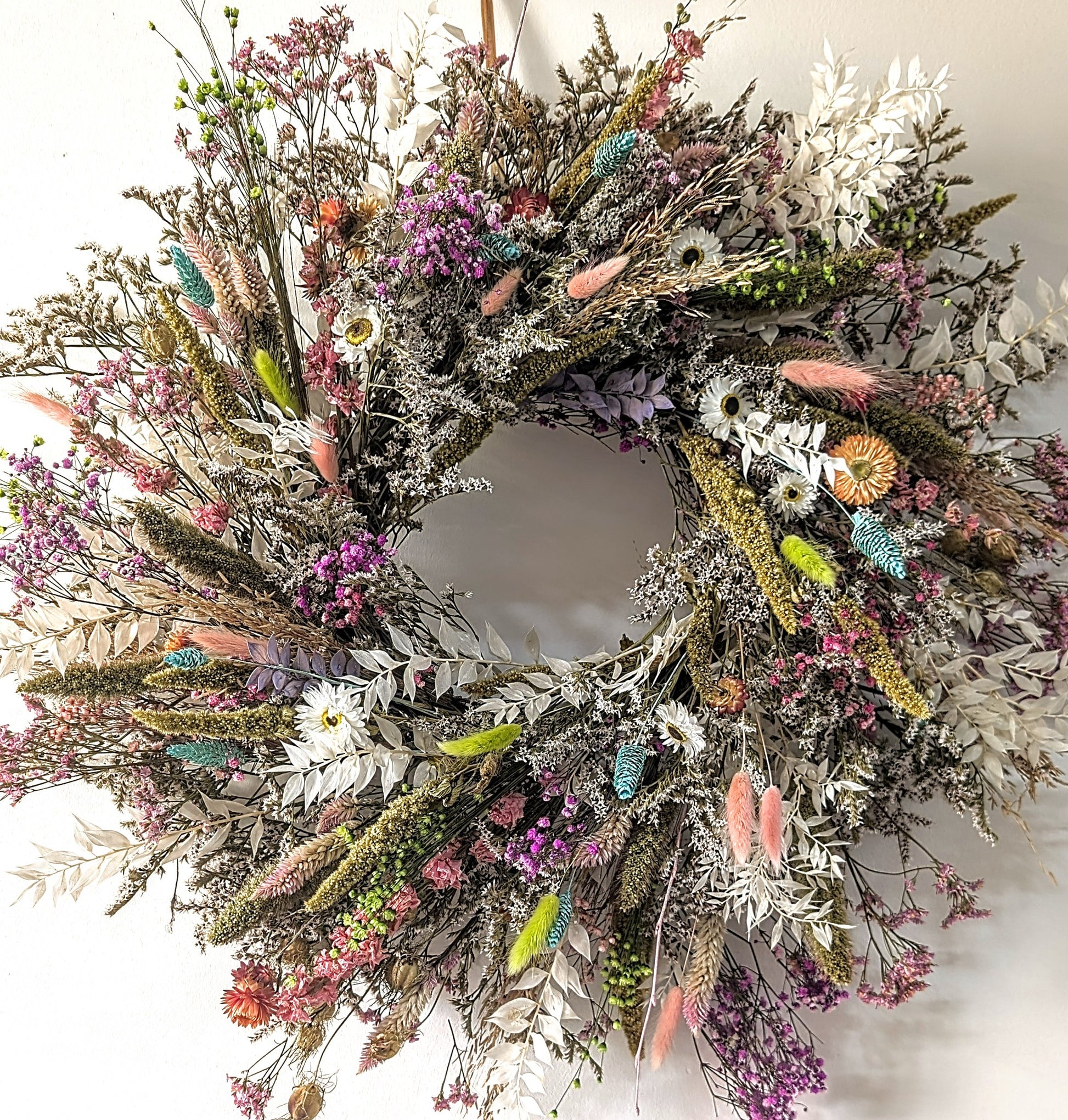 Wild, full, large pastel shaded dried flower wreath.