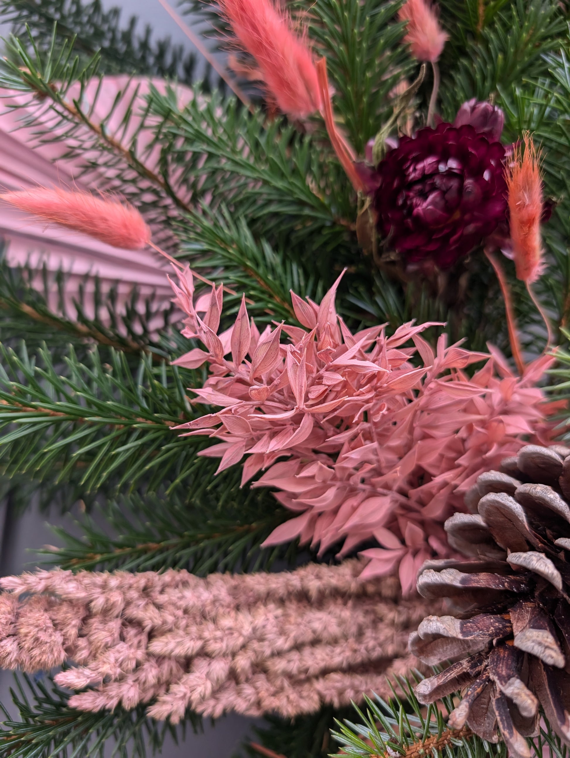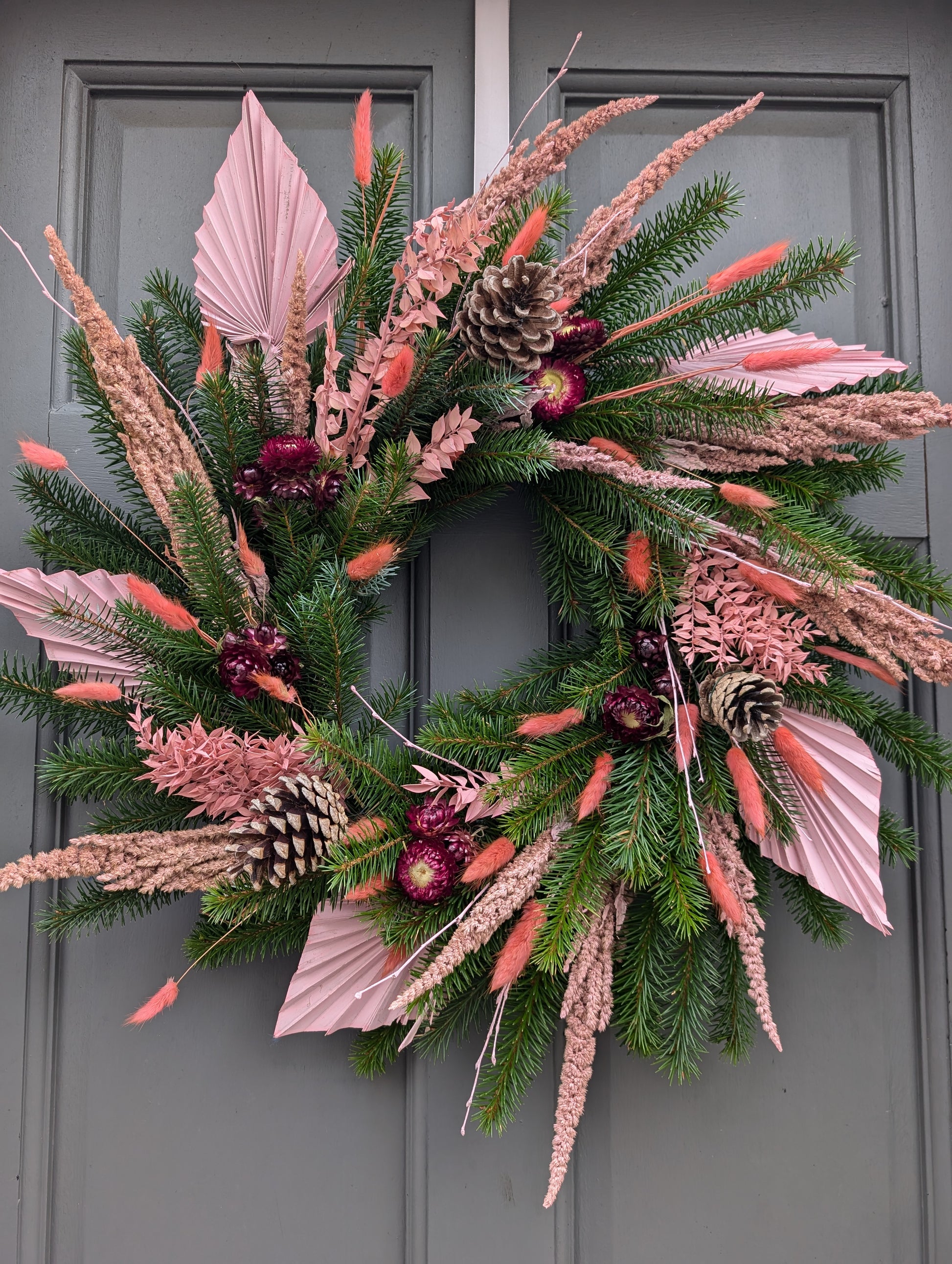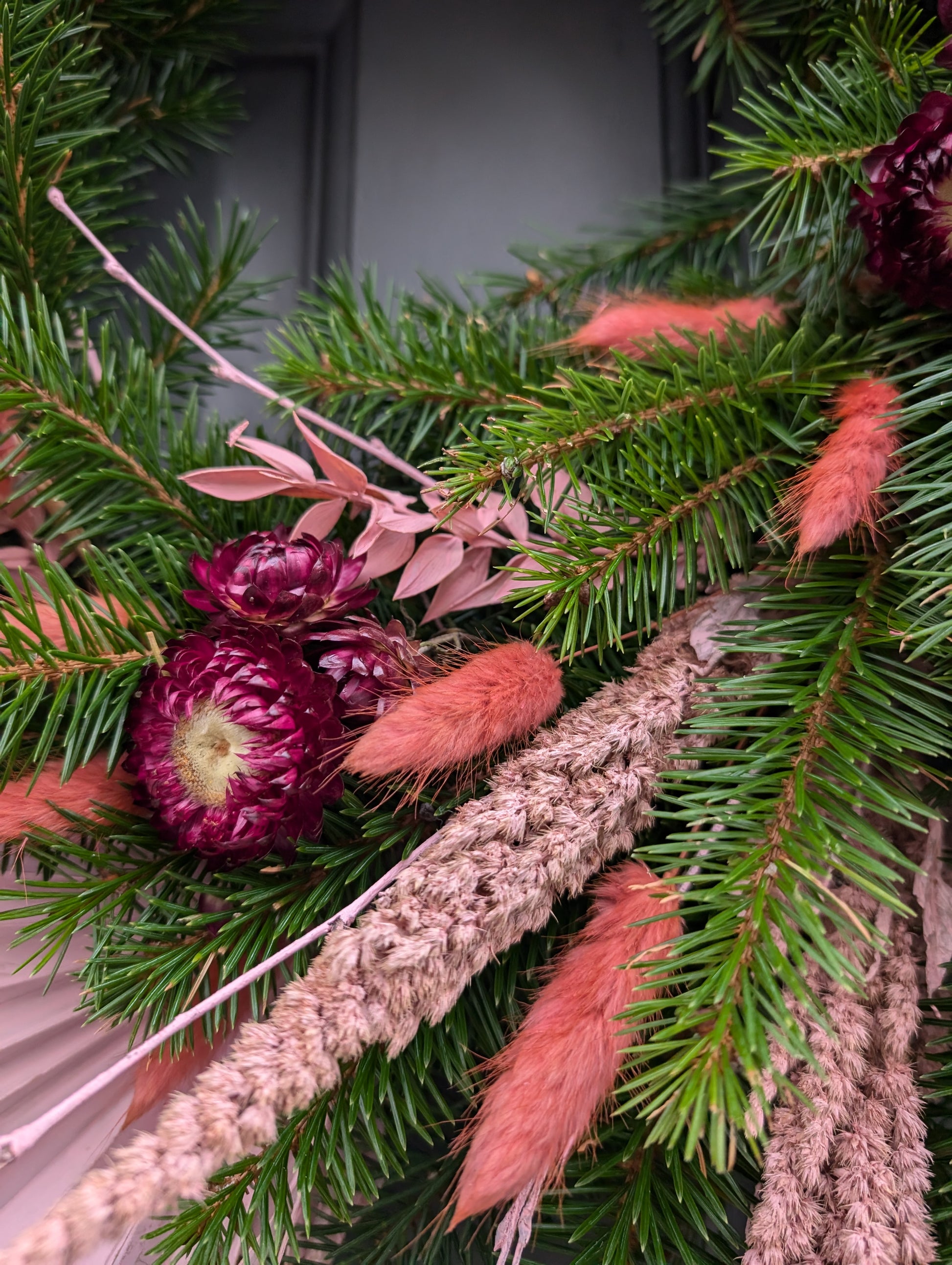 Christmas pink star wreath made with a mixture of fresh fir and colourful dried flowers made on a metal base.