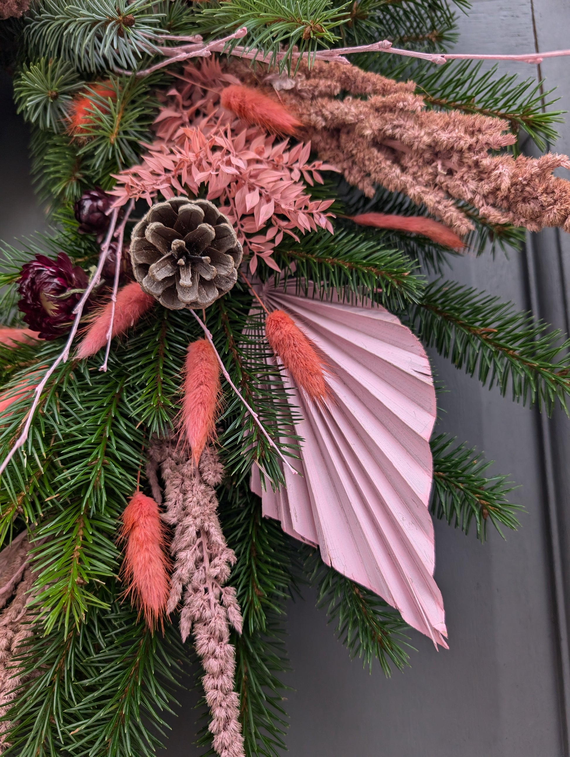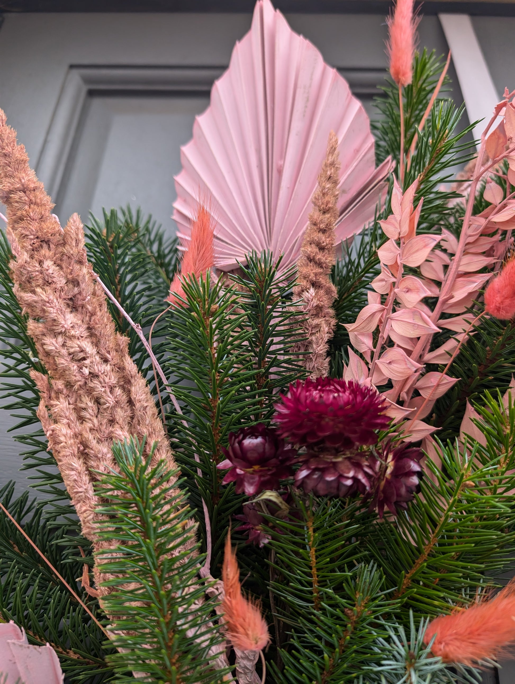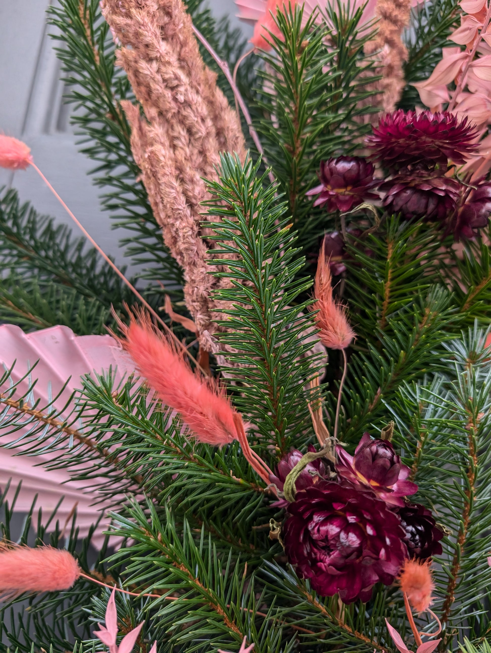 Christmas pink star wreath made with a mixture of fresh fir and colourful dried flowers made on a metal base.