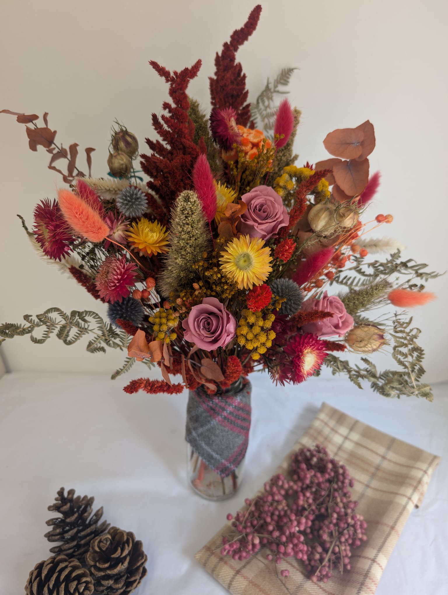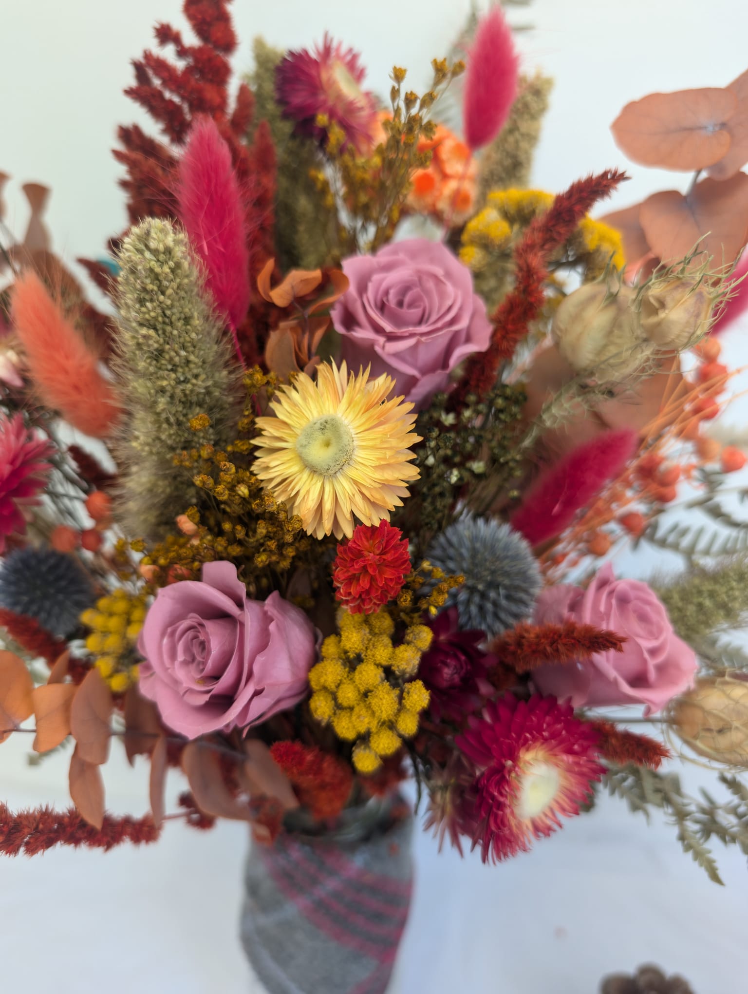 A celebration of the seasons in full bloom, Harvest Haze brings together the fiery hues of late summer and the earthy textures of early autumn. This handcrafted dried flower bouquet features a vivid mix of preserved blooms, including blush roses, sunburst strawflowers, burgundy amaranthus, thistle, craspedia, and fluffy grasses — all carefully selected for their beauty and longevity.