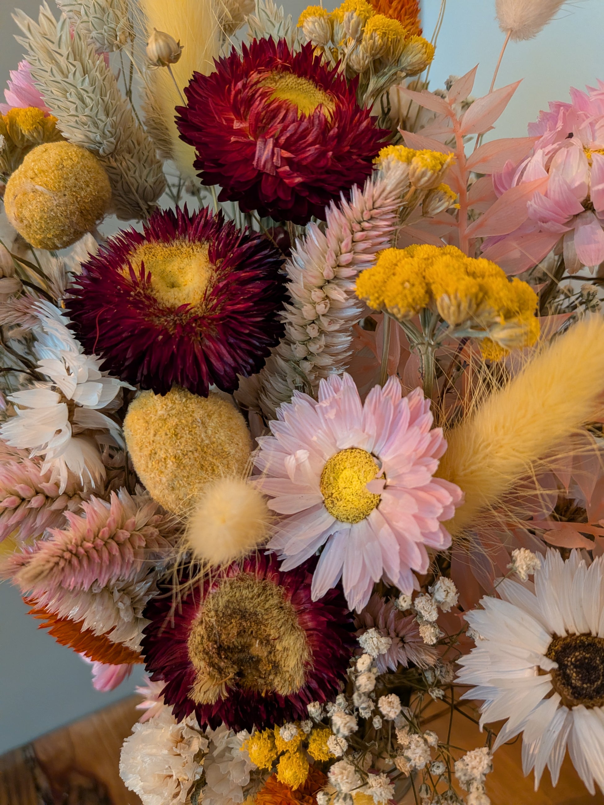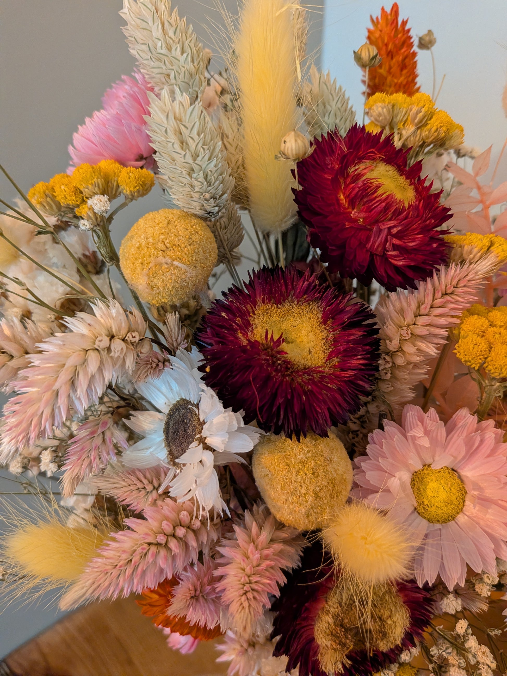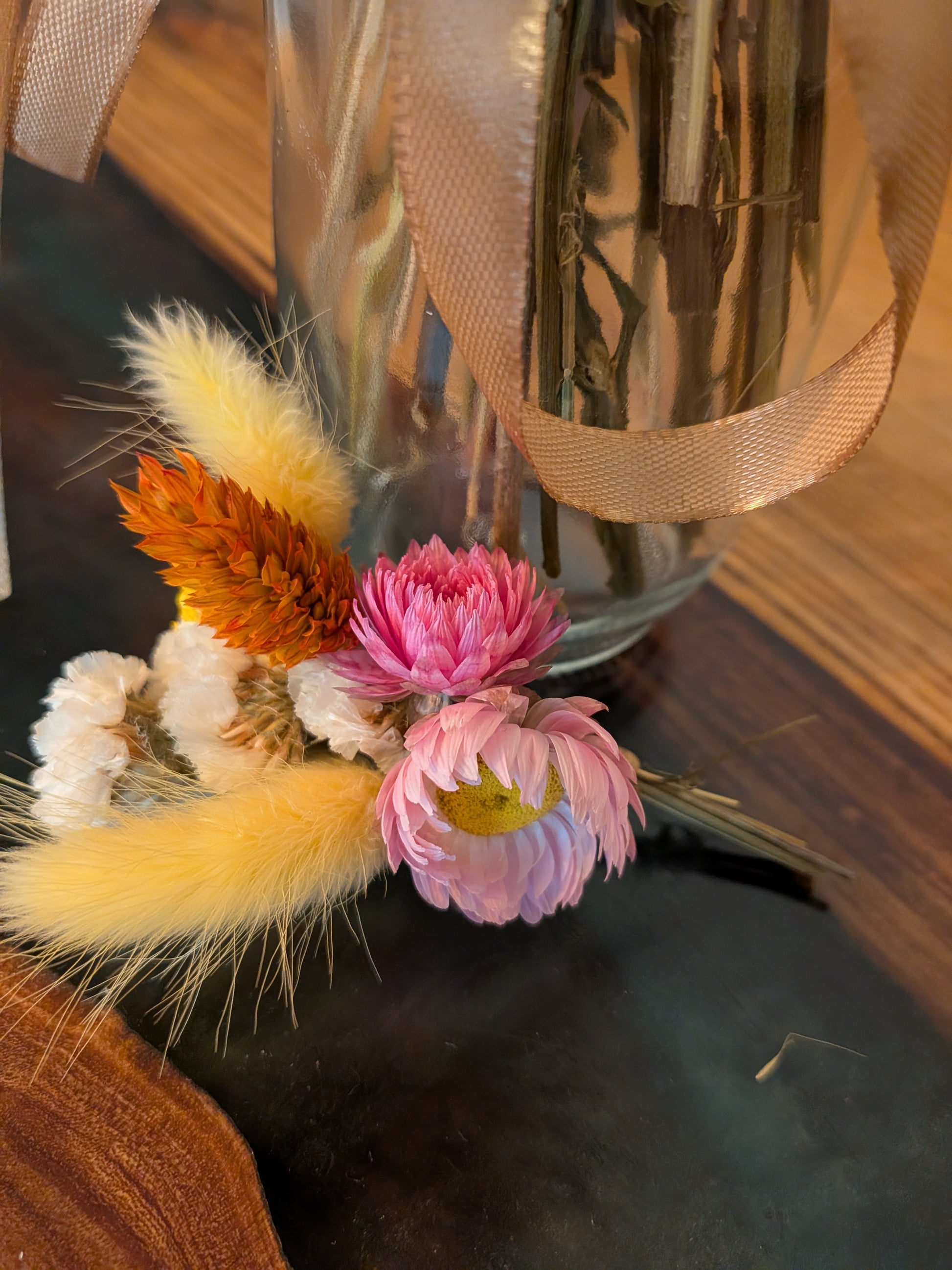 Sunlit beam is a cheerful dried floral arrangement blending soft pinks, warm yellows, creamy whites, and pops of golden orange. Filled with textured grasses, strawflowers, and delicate meadow stems, it brings an easy, rustic warmth to any space. Long-lasting and fuss-free, it’s a perfect little glow of sunshine for shelves, desks, or gifting.